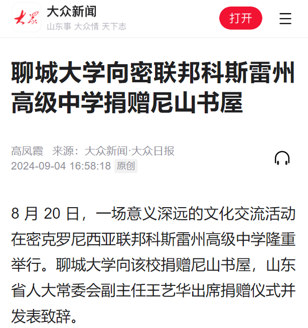 【大众日报客户端】报道beat365官方网站向密联邦科斯雷州高级中学捐赠尼山书屋