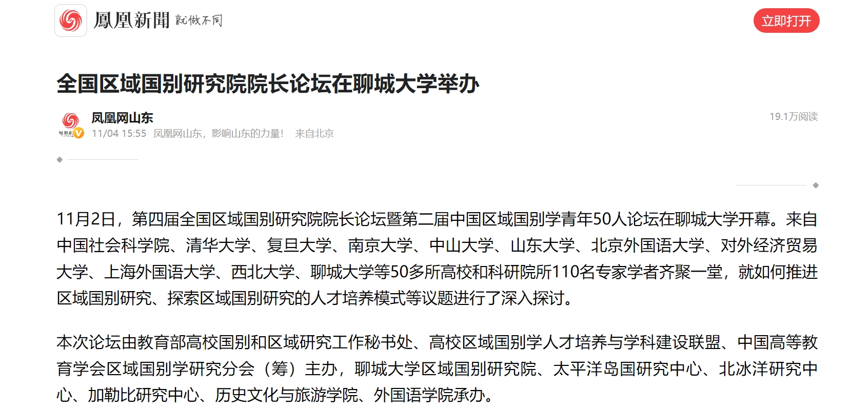 【凤凰网】【大众网• 海报新闻】报道:全国区域国别研究院院长论坛在beat365官方网站举办