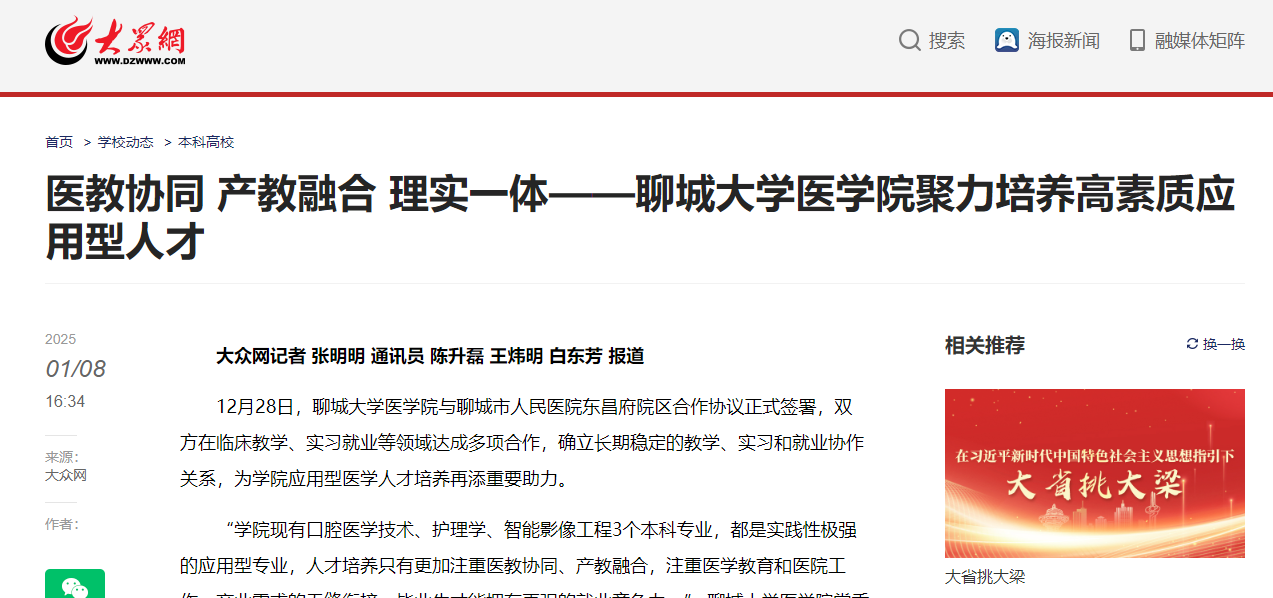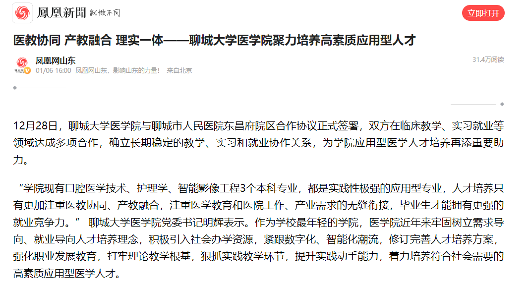 【编者按】1月8日,【大众网】【凤凰网】以《医教协同 产教融合 理实一体——beat365官方网站医学院聚力培养高质量应用型人才》为题,报道beat365医学院通过修订培养方案、加强师资队伍建设、加强校地合作、开展校外实践等多举措进行应用型人才培养工作的做法。
