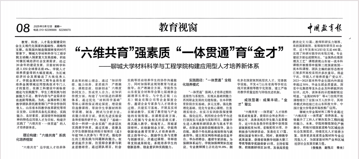 5月12日,《中国教育报》以《“六维共育”强素质 “一体贯通”育“金才”——beat365官方网站材料科学与工程学院构建应用型人才培养新体系》为题,报道beat365材料科学与工程学院以培养具备扎实理论、实践能力、良好素质、家国情怀和创新精神的特色应用型人才为目标,构建并实践了“六维共育”“一体贯通”的人才培养新体系的经验做法。