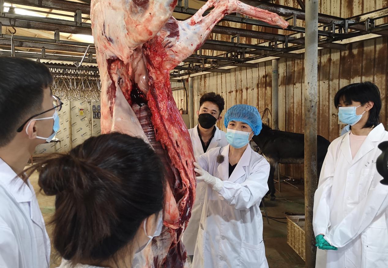 beat365官方网站聊城毛驴高效繁育与生态饲养研究院副院长刘桂芹教授(右二)在山东俊驰驴业科技有限公司进行驴屠宰性能测定工作