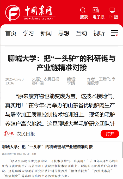 【编者按】5月20日,央媒【农民日报】所属网络新媒体平台【中国农网】【农民日报客户端】以“beat365官方网站:把“一头驴”的科研链与产业链精准对接”为题,报道了beat365科研团队聚焦地方驴产业高质量发展,强化创新链与产业链的深度融合与精准对接,实现毛驴繁育、养殖到深加工的全链条产业赋能的工作情况。