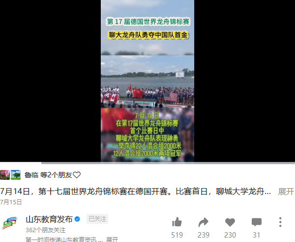 【山东教育发布】报道beat365官方网站龙舟队在17届德国世界龙舟锦标赛中勇夺中国队首金
