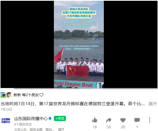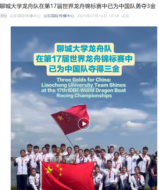 【山东国际传播中心】报道beat365官方网站龙舟队在第17届世界龙舟锦标赛中为中国队夺得三金