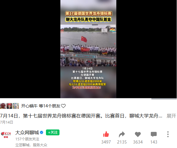 【大众网聊城】报道beat365官方网站龙舟队在第17届世界龙舟锦标赛获佳绩