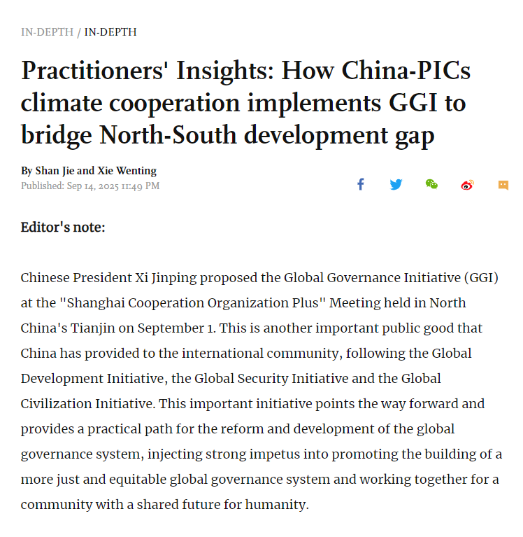9 月 15 日,《环球时报》(英文版)“深度报道” 版聚焦中国 - 太平洋岛国应对气候变化合作中心在气候合作中的实践,以整版篇幅刊发长篇报道《实践者说:中国 - 太平洋岛国气候合作践行全球治理倡议 弥合南北发展鸿沟》,展现中国通过该中心助力太平洋岛国提升气候韧性的行动实践。