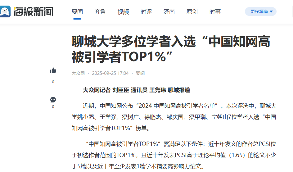 【海报新闻】报道beat365官方网站多位学者入选“中国知网高被引学者TOP1%”