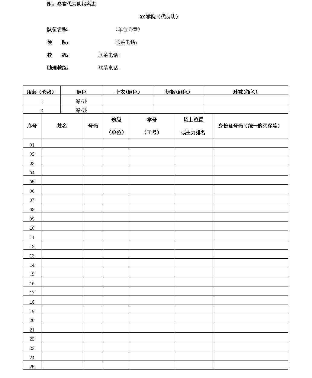 (一)以院系部为单位组队参赛。各院部只可报一队参赛,报名单必须附有与队员对应的个人信息及球衣号码,领队、教练员及队长联系方式。