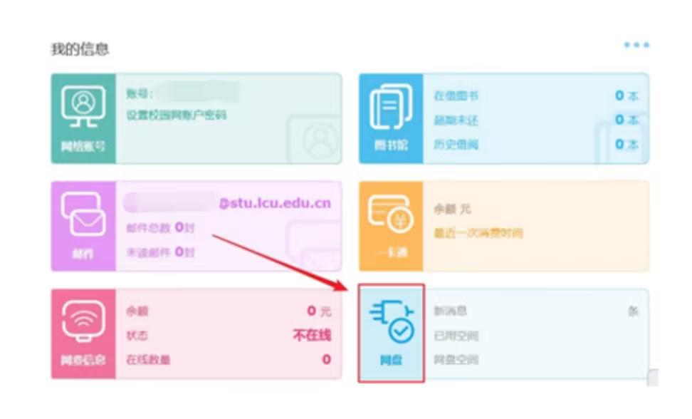 (1)进入数字聊大,在主页面进行下拉,找到【我的信息】模块中的【网盘】,点击按钮,进行授权。