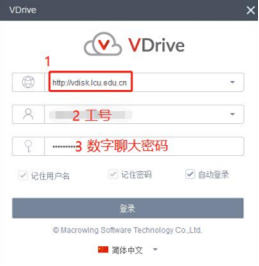 (5)双击图标进入客户端,输入网盘地址(http://vdisk.lcu.edu.cn)、工号和数字聊大密码。可勾选自动登录,实现开机自动登录网盘。