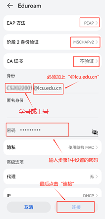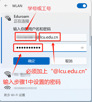 用户开通校园网账号并设置密码后,即可登录Eduroam网络, Eduroam网络的用户名为“学号或工号@lcu.edu.cn”,登录密码与校内“01LCU-WiFi”“02beat365官方网站”两个校园网络登录密码一致。