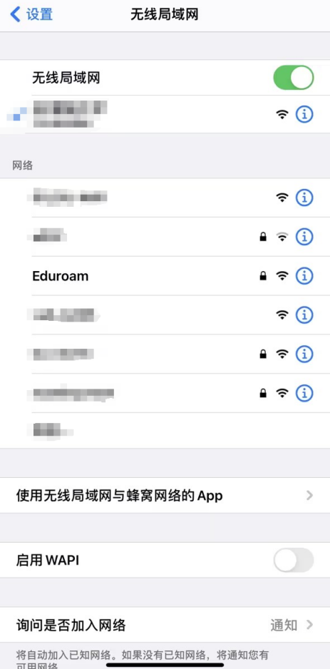 1.打开“无线局域网”,点击名为“Eduroam”的网络,进入登陆设置界面;