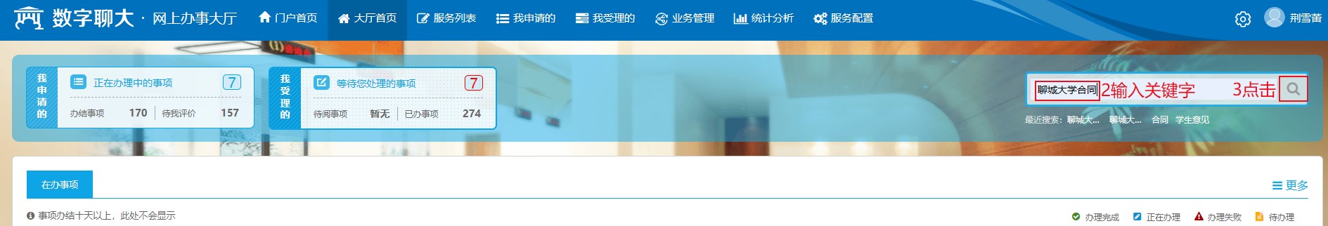 方式一:打开浏览器,进入数字聊大,在页面顶部导航栏,点击“办事大厅”,具体步骤参照以下操作即可。