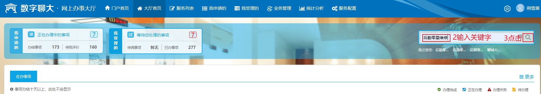 方式一:打开浏览器,进入数字聊大,在页面顶部导航栏,点击“办事大厅”,具体步骤参照以下操作即可。