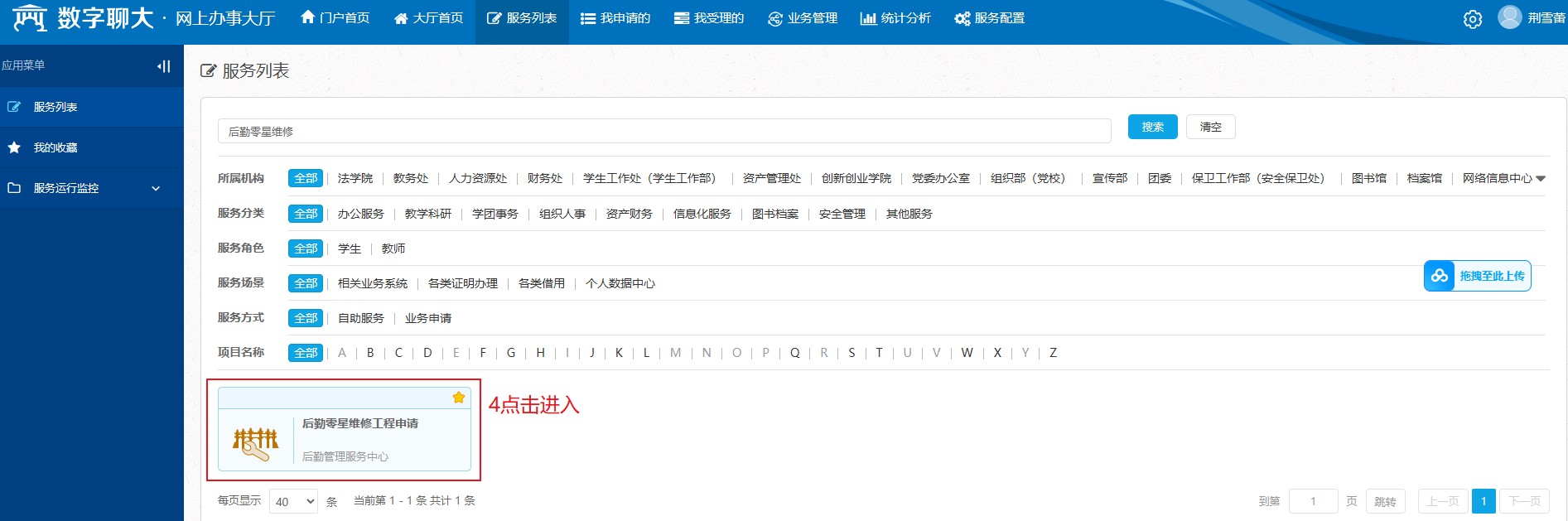 为进一步推进信息化赋能管理服务职能,通过线上流转替代传统纸质审核,缩短审核周期,实现“数据多跑路,师生少跑腿”,提高审核效率。网络信息中心联合后勤管理服务中心依托“数字聊大”平台开发完成了“后勤零星维修工程申请”网上办事流程。