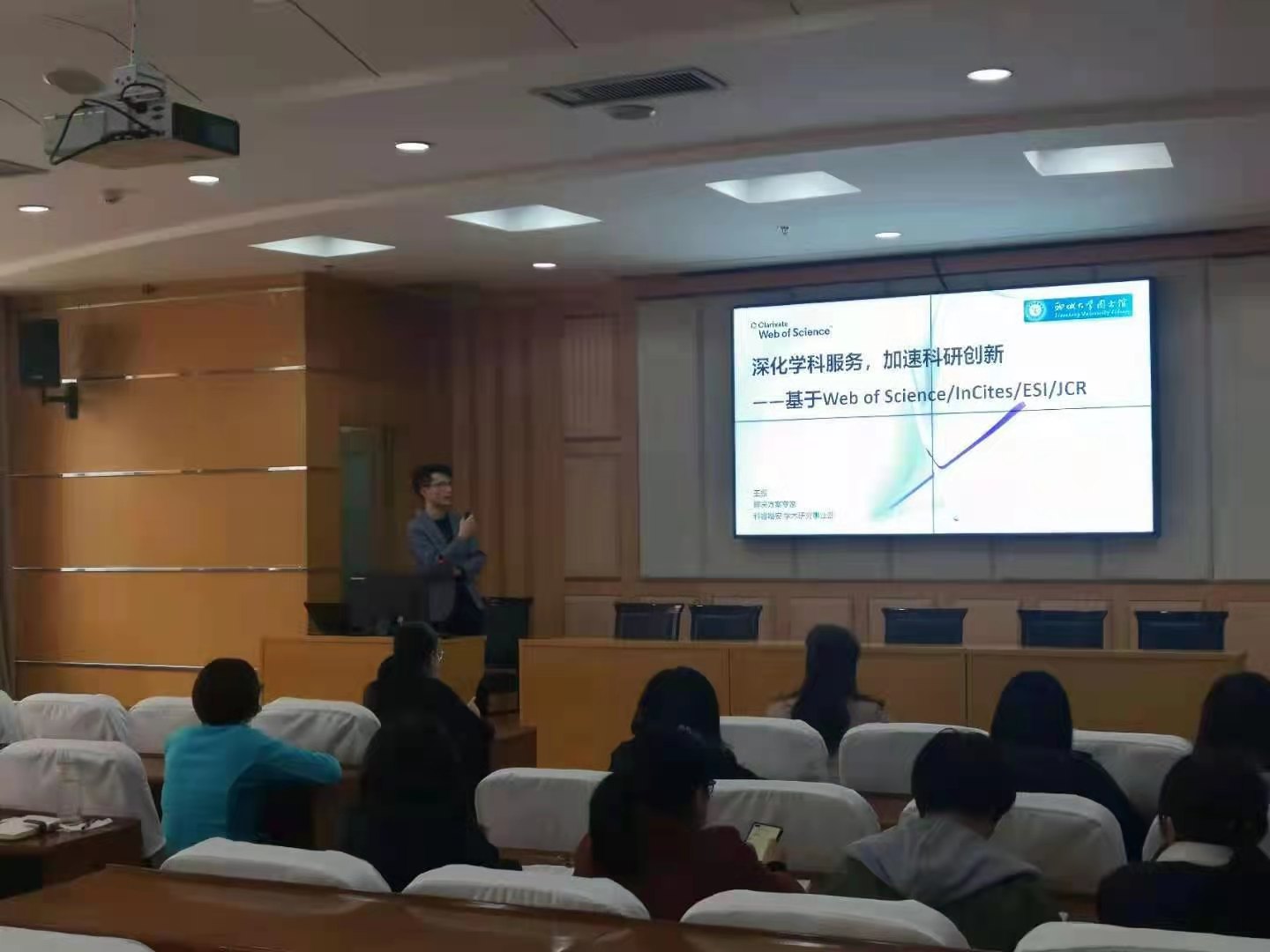 4月21日下午,图书馆邀请科睿唯安学术研究事业部专家王振在图书馆小报告厅举办了以“深化学科服务,加速科研创新——基于Web of Science/InCites/ESI/JCR"为主题的讲座。讲座由图书馆学科信息服务部主任许磊主持,学科分析团队成员和学科馆员到场聆听。