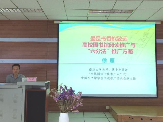 7月8日下午,南京大学信息管理学院教授徐雁在逸夫图书馆作了题为《最是书香能致远——高校图书馆阅读推广与“六分法”推广方略》的专题讲座。讲座由图书馆馆长惠鸿忠主持,图书馆副馆长赵国强、副馆长王凤刚、各个部门负责人及部分馆员聆听了讲座。