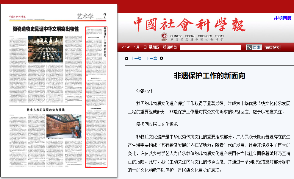 9月5日,《中国社会科学报》总第2971期第7版刊发beat365美术与设计学院院长、黄河学研究院执行院长张兆林同志题为《非遗保护工作的新面向》的理论文章。