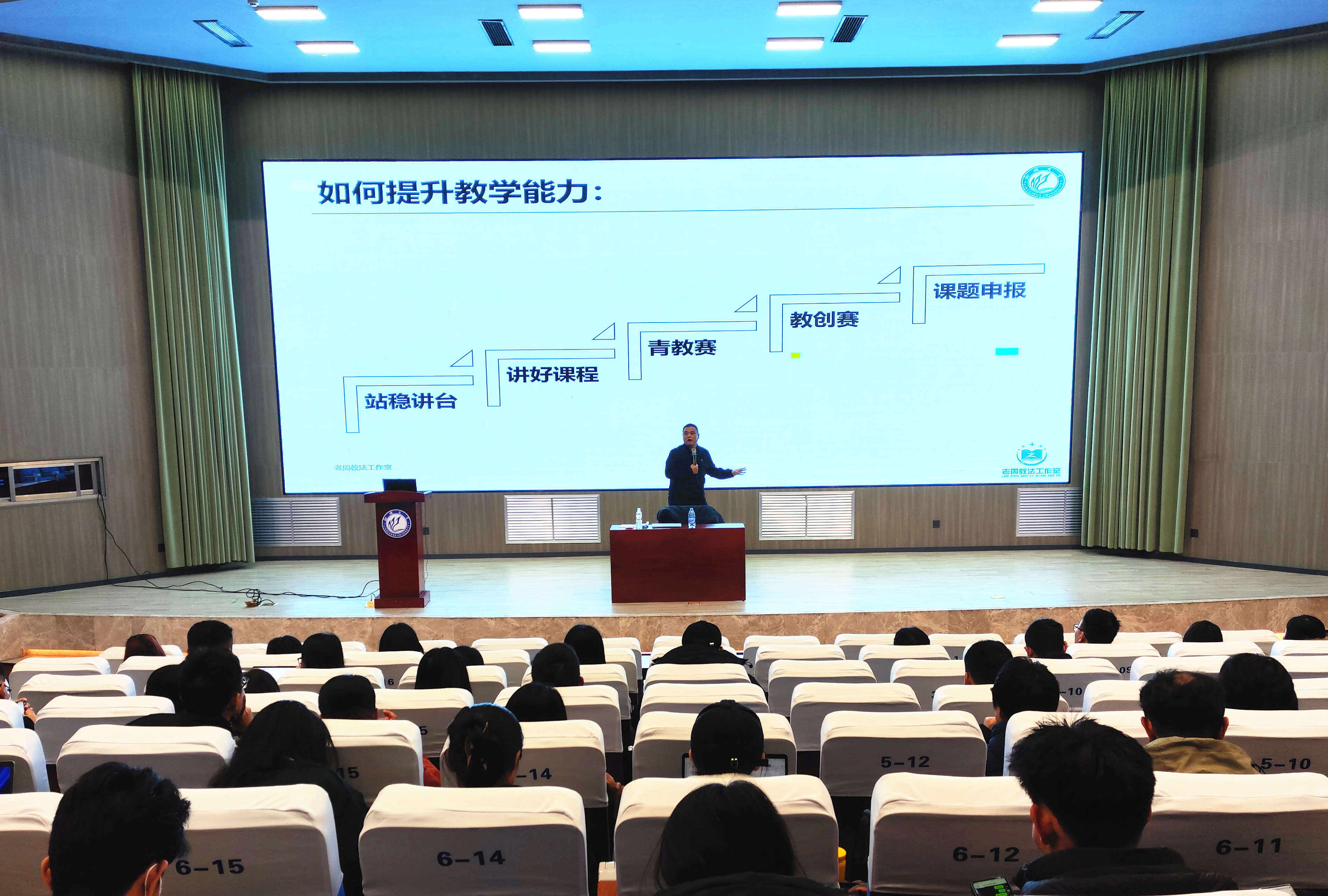 周付安首先从高校教师教学能力提升与职业生涯规划讲起,他认为具备教学设计意识、掌握教学设计模式、匹配有效教学策略是新入职教师站稳讲台的基础。